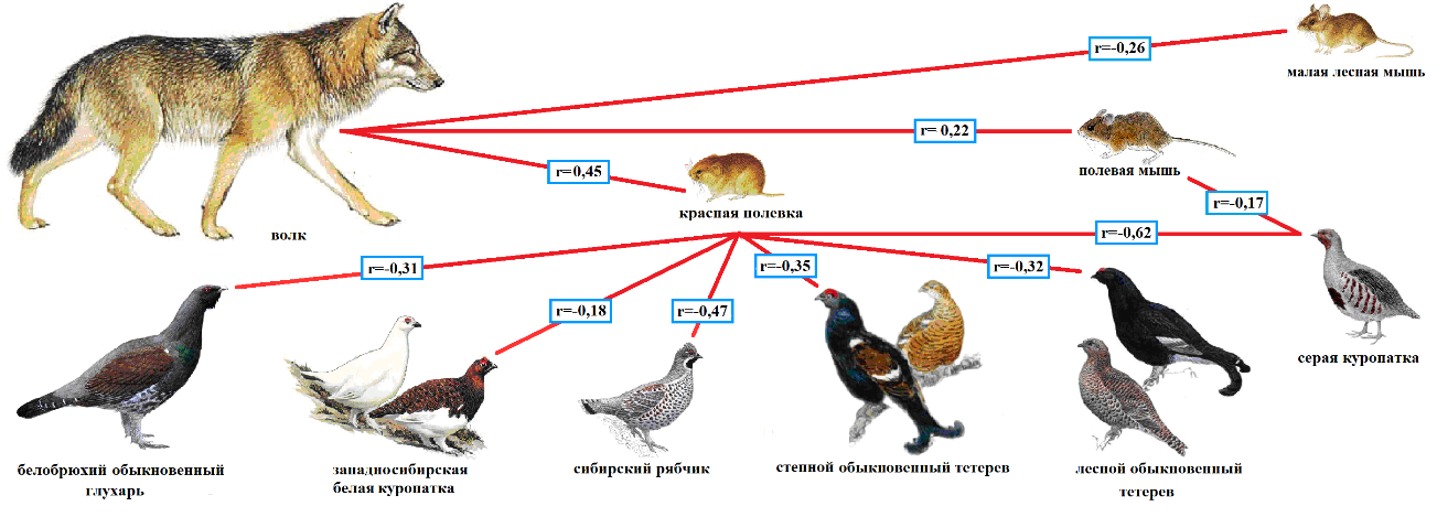 Волк — всеядный хищник, основу его питания составляют копытные животные и менее крупная добыча: зайцы, суслики, бобры, мышевидные грызуны, сидящие на гнёздах или кормящиеся на земле курообразные и их кладки яиц и птенцы, другие животные и растительные объекты (Новиков, 1956; Аристов, Барышников, 2001). Сопряжение многолетней численности популяций видов в триаде «хищные звери – мелкие мышевидные грызуны – дикие курообразные птицы» с участием волка характеризуется корреляционной связью с численностью красной полевки, полевой мыши, малой лесной мыши. Однако лишь численность популяций красной полевки и полевой мыши характеризуется отрицательной корреляционной связью с численностью популяций диких курообразных птиц (белобрюхого обыкновенного глухаря, степного обыкновенного тетерева, лесного обыкновенного тетерева, сибирского рябчика, западносибирской белой куропатки, серой куропатки). Следовательно, изменение сопряженной численности популяций волка и мелких мышевидных грызунов двух видов оказывает противофазное изменение сопряженной численности популяций грызунов и диких курообразных птиц шести видов/подвидов (рис. 13).