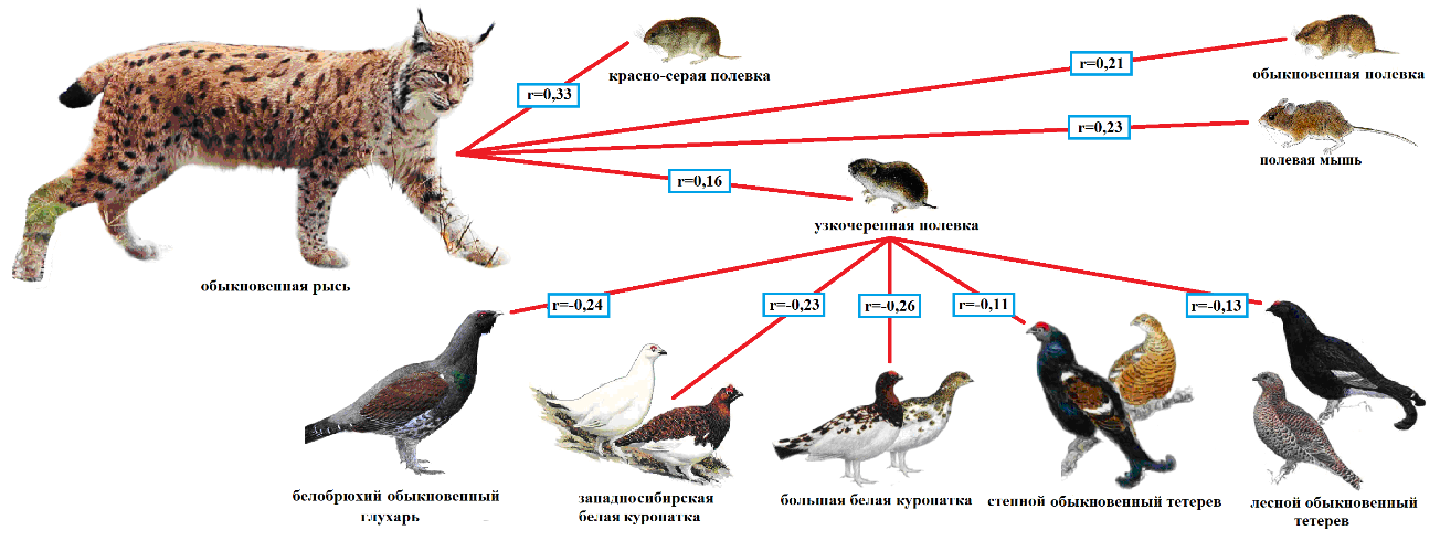Основу рациона обыкновенной рыси составляют зайцы-беляки (Аристов, Барышников, 2001), она постоянно охотится на тетеревиных птиц и мелких мышевидных грызунов (Новиков, 1956). Сопряжение многолетней численности популяций видов в триаде «хищные звери – мелкие мышевидные грызуны – дикие курообразные птицы» с участием рыси на территории Омской области с численностью красно-серой полевки, узкочерепной полевки, обыкновенной полевки, полевой мыши характеризуется положительной корреляционной связью. Однако только численность популяции узкочерепной полевки характеризуется отрицательной корреляционной связью с численностью популяций белобрюхого обыкновенного глухаря, степного обыкновенного тетерева, лесного обыкновенного тетерева, западносибирской белой куропатки, большой белой куропатки. Следовательно, лишь изменение сопряженной численности обыкновенной рыси и грызуна одного вида оказывает противофазное изменение сопряженной численности пяти видов/подвидов диких курообразных птиц (рис. 3).