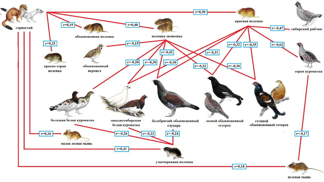 Многолетняя сопряженная численность популяции горностая имеет положительную корреляционную связь с численностью популяций мелких мышевидных грызунов еще пяти видов: полевки экономки, узкочерепной полевки, красной полевки, полевой мыши, малой лесной мыши. Изменения многолетней численности популяций грызунов этих видов характеризуется отрицательной корреляционной связью с численностью популяций видов/подвидов диких курообразных. Следовательно, лишь изменение численности популяций горностая и мелких мышевидных грызунов пяти видов оказывает противофазное изменение сопряженной численности грызунов и популяций диких курообразных птиц семи видов/подвидов (рис. 7).